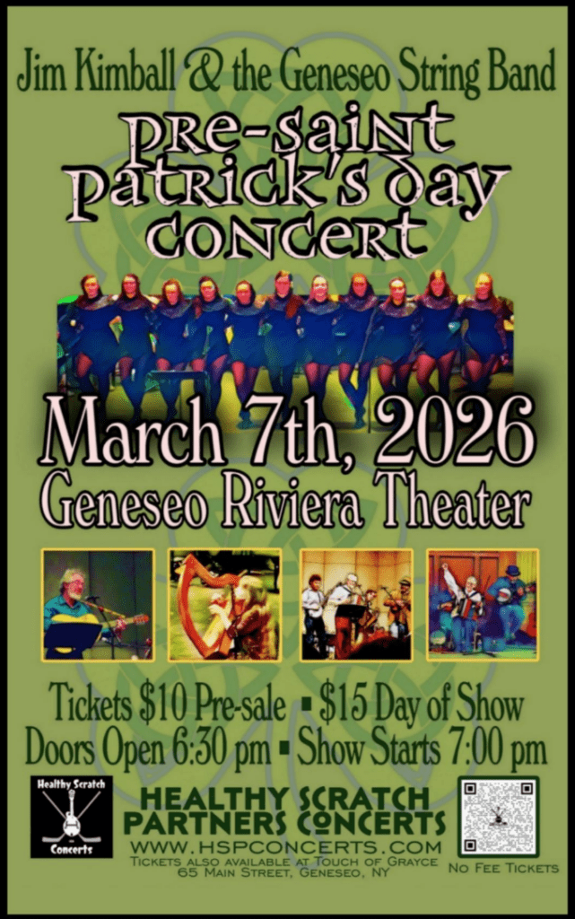 Join Glenn McClure, Jim Kimball and the Geneseo String Band for the decades’-long Geneseo tradition of the Pre-St Patrick’s Day Concert on Saturday March 7 at 7PM, now at the Riviera Theater, Geneseo, NY.